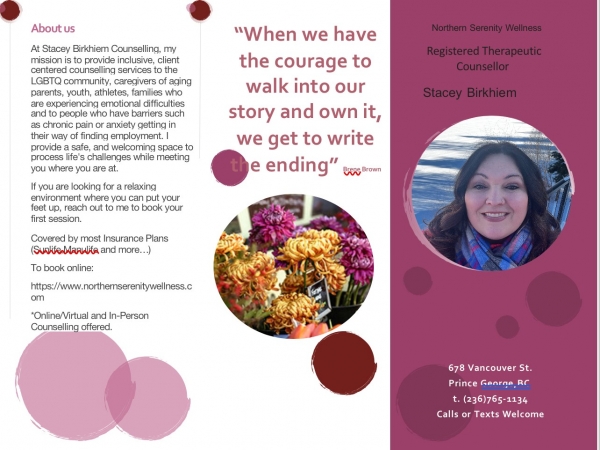 Stacey Birkhiem Counselling provides inclusive, client‑centred support. She offers a safe and welcoming space for anyone facing life’s challenges through virtual services.more info